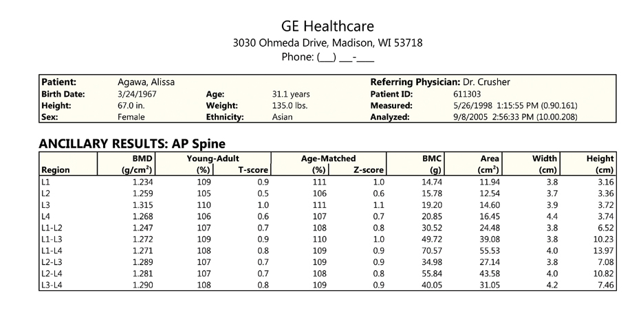 Sample GE Healthcare DXA Bone Density Report Pages Most GE Healthcare DXA (dual energy x-ray absorptiometry) bone density reports have at least 4 pages including a summary report prepared by the test center with a diagnosis, densitometry results and recommendations. Below are four other types of pages found on a GE bone density report. 1. Information, graphs and an image of the lumbar spine 2. Detailed ancillary images of the lumbar spine 3. Information, graphs, and images of the right and left hips 4. Detailed ancillary results of the right and left hips 5. Right forearm report page. Occasionally, the forearm is scanned in place of the hips. 6. Basic bone density information about the spine and both hips of another patient along with photos. 7. Detailed ancillary results of the right and left hips