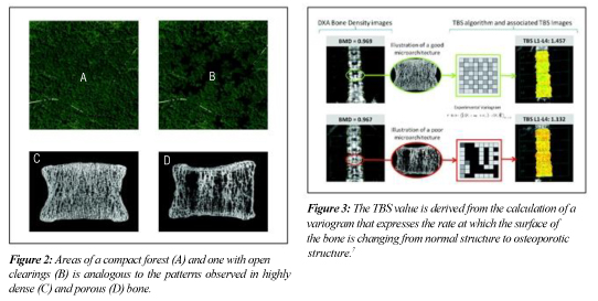 It is an  ■ It's a better predictor of fracture risk than DXA scores alone. ■ The TBS score is unaffected by abnormal bony outgrowths (osteophytes) on the spine of arthritic patients. In contrast, bone density scores of the spine are often abnormally high in people with osteoarthritis of the spine. ■ The TBS score is a better indicator of bone strength than a bone density T-score. ■ TBS determinations have high reproducibility with values ranging from 1.1% - 1.9% C.V. ■ The TBS report is generated simultaneously with the standard DXA spine printout so it's fast and doesn't involve any extra time. The images below show examples of dense and porous trabecular bone in vertebrae. This is what the TBS software measures.