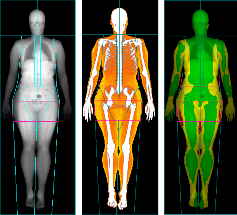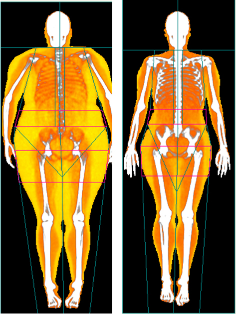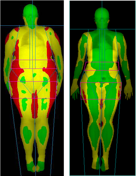 3ab (left two images). Color coded images with a clear distinction of bone, fat and lean; 3cd color mapping images to help you understand where high areas of fat are located and visualize changes over time. Different colors distinguish areas of high, medium and low fat.
