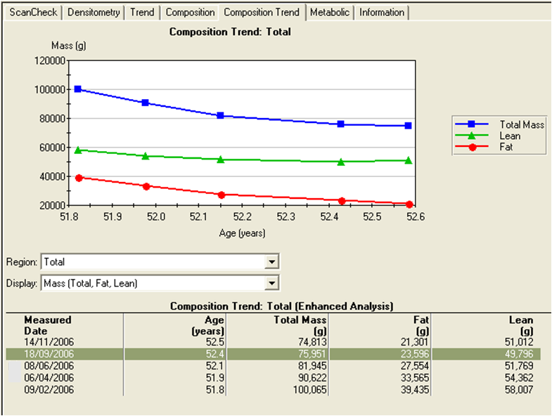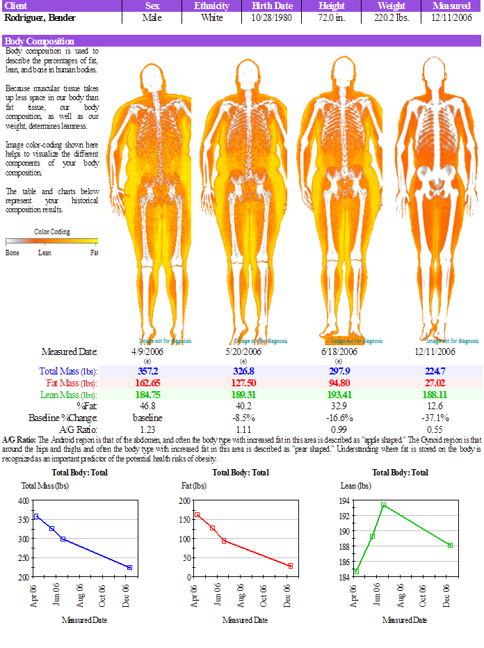 GE Healthcare DXA Whole Body Composition Analysis GE Healthcare provides DXA ((dual energy x-ray absorptiometry) body composition assessment tools that are designed to enable clinicians to help their patients understand how diet, lifestyle and exercise programs impact overall health and human performance. Their body composition reports are used for: ■ Clinical condition assessments to understand the cardio-metabolic health risks of patients ■ Weight management to demonstrate tangible progress & motivate patients ■ Sports medicine to monitor the effect of training and nutrition on body condition ■ Wellness assessment to enhance overall health The images below show 1. Data visualization of the direct measurement of fat, bone and lean (the mass of the body minus the fat) with imaging tools 2. Precise results of full analysis of total body and by region, which gives clinicians the tools to help detect significant changes in body composition in a short period of time 3ab (left two images). Color coded images with a clear distinction of bone, fat and lean to help you understand a person's body composition and visualize changes over time; 3cd. color mapping images to help you understand where high areas of fat are located and visualize changes over time. Different colors distinguish areas of high, medium and low fat. 4. Graph and table with key body composition data to monitor progress over time. Data is displayed versus baseline for quick calculation of changes in fat and lean tissue. 5. Sample report page showing progress over eight months. Several standard templates are included with GE software with flexible options for creating personalized templates for reports. 6. CoreScan application dedicated to quantifying visceral fat versus subcutaneous fat. Visceral fat is located around the abdomen and surrounding organs and is linked to problems such as bad cholesterol, diabetes, hypertension, heart disease and stroke. Subcutaneous fat is found underneath the skin and causes dimpling and cellulite. 7. GE total body bone density report 1. Imaging tools